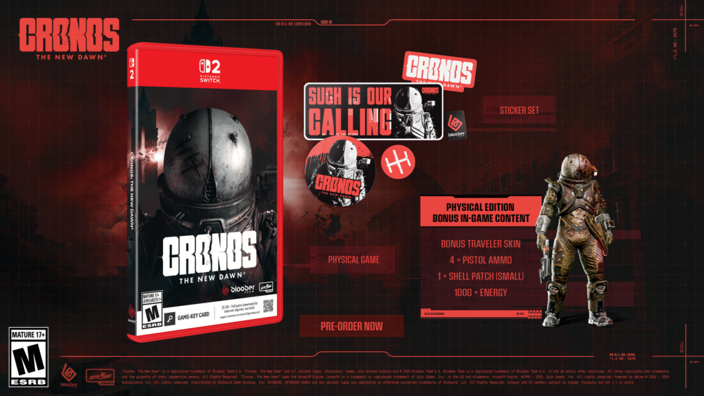 A Bloober Team confirmou que Cronos: The New Dawn não apenas chegará em 5 de setembro de 2025 para Nintendo Switch 2, PC, PlayStation 5 e Xbox Series X|S, mas também contará com uma edição física especial exclusiva para o Switch 2. A novidade é fruto de uma parceria com a distribuidora Skybound Games e já está disponível para pré-venda em lojas selecionadas no Brasil e no exterior.